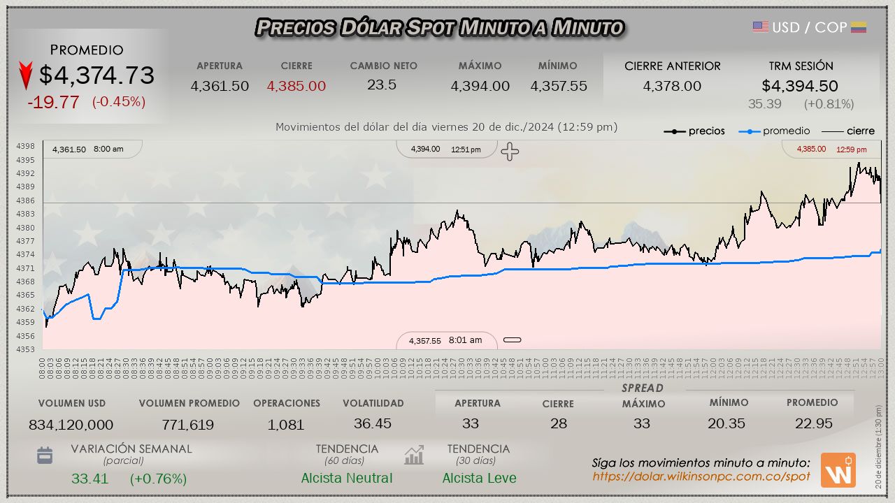 La sesión dió inicio con un precio de apertura de $4,361.50, marcaba así un descenso comparado con la TRM vigente de $4,394.50. Durante la jornada, el precio alcanzó un máximo de $4,394.00 pesos, y un mínimo de $4,357.55 pesos, generando una volatilidad intradía de $36.45 pesos. Al final de la sesión, el precio cerró al alza respecto a la apertura a un precio de $4,385.00 pero por debajo de la TRM del día, al igual que el promedio ponderado que se ubicó en $4,374.73, una pérdida de $-19.77 pesos, un -0.45% menos respecto a la TRM.