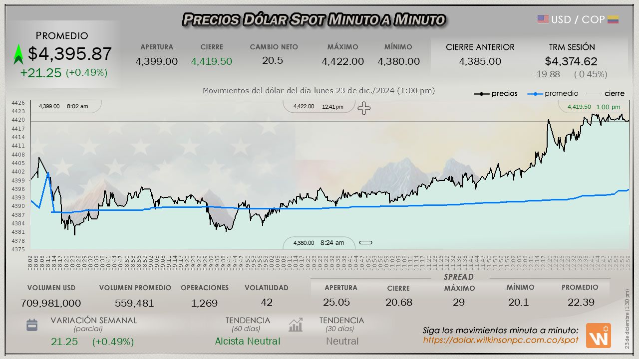 Resumen de las operaciones del mercado del dólar SPOT en Colombia correspondiente al lunes 23 de diciembre de 2024.