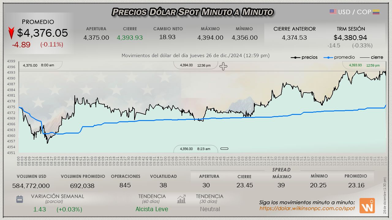 Resumen de las operaciones del mercado del dólar SPOT en Colombia correspondiente al jueves 26 de diciembre de 2024.