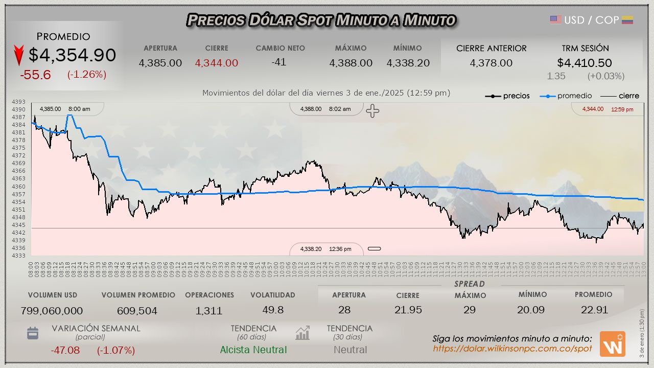 Resumen de las operaciones del mercado del dólar SPOT en Colombia correspondiente al viernes 3 de enero de 2025.