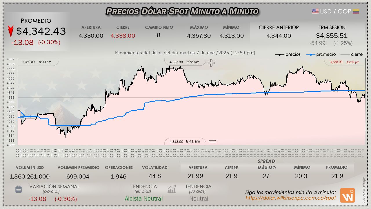 Resumen de las operaciones del mercado del dólar SPOT en Colombia correspondiente al martes 7 de enero de 2025.