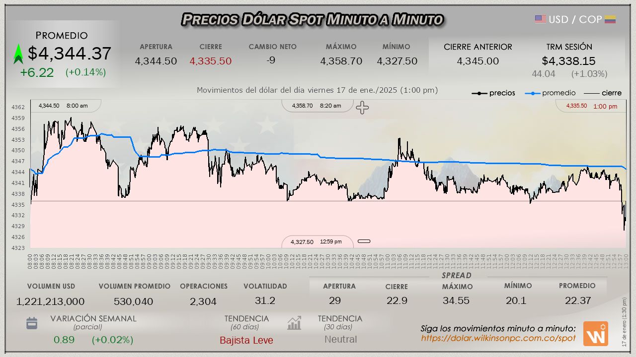 La jornada inició con un precio de apertura de $4,344.50, que superaba a la TRM vigente de $4,338.15. Durante la jornada, el precio alcanzó un máximo de $4,358.70 pesos, y un mínimo de $4,327.50 pesos, generando una volatilidad intradía de $31.20 pesos. Al cierre de la jornada, se situó en $4,335.50, a la baja respecto a la apertura y por debajo de la TRM del día, aunque el promedio ponderado fue suficiente para marcar un alza de $6.22, terminó con un promedio de $4,344.37 pesos, un aumento del 0.14% respecto a la TRM.