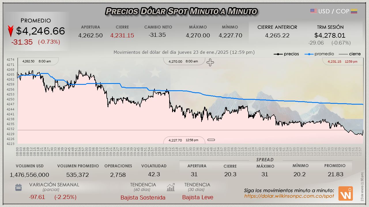 Resumen de las operaciones del mercado del dólar SPOT en Colombia correspondiente al jueves 23 de enero de 2025.