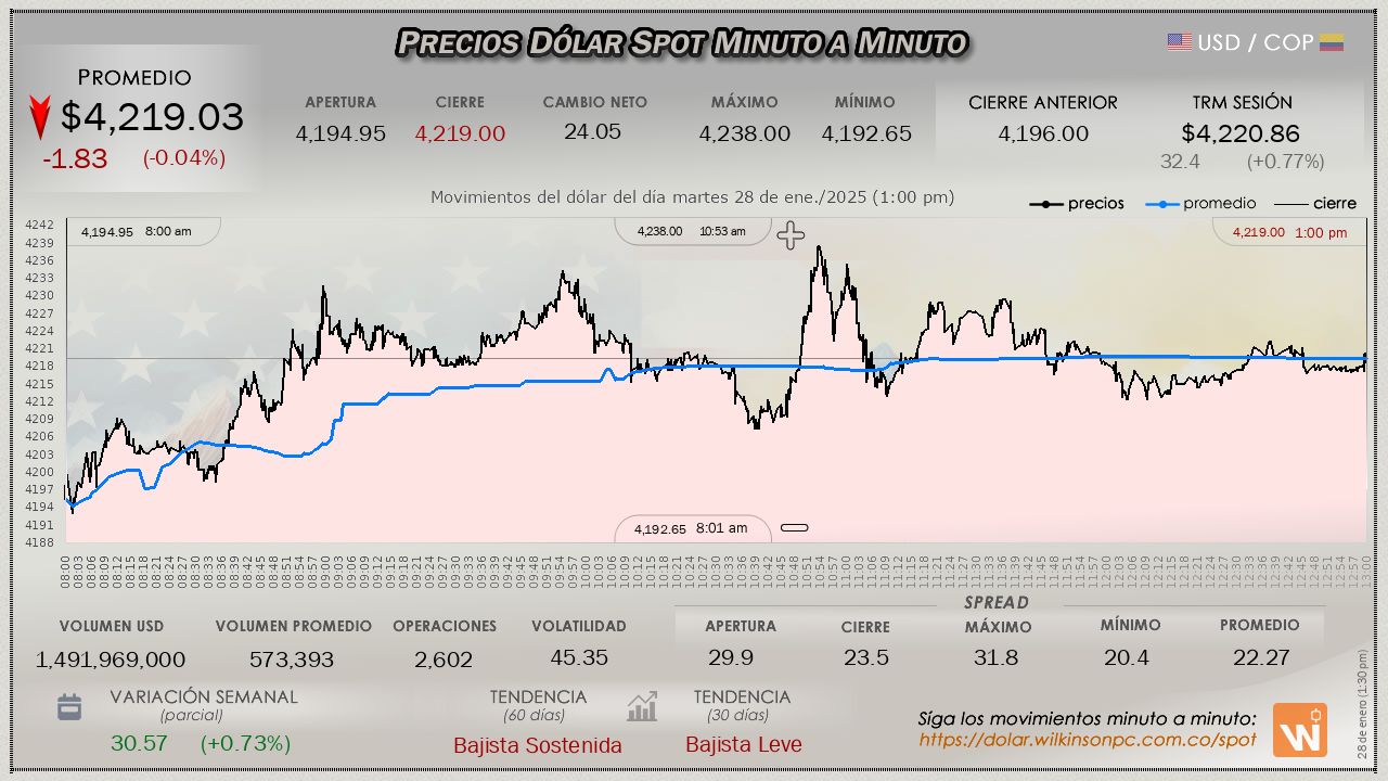 Resumen de las operaciones del mercado del dólar SPOT en Colombia correspondiente al martes 28 de enero de 2025.