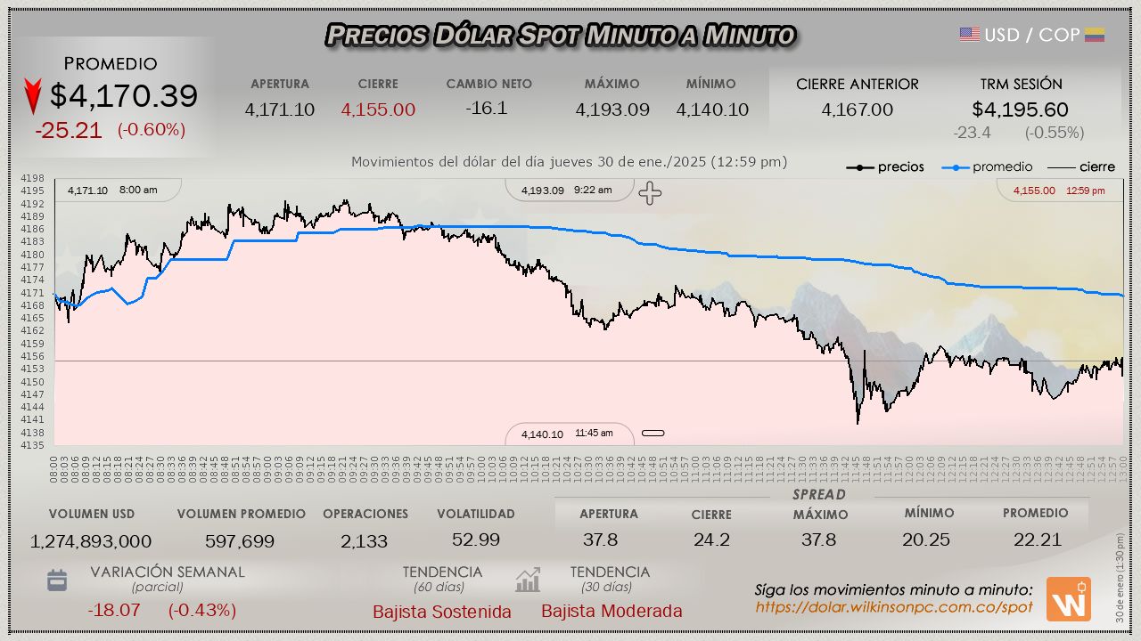 Resumen de las operaciones del mercado del dólar SPOT en Colombia correspondiente al jueves 30 de enero de 2025.