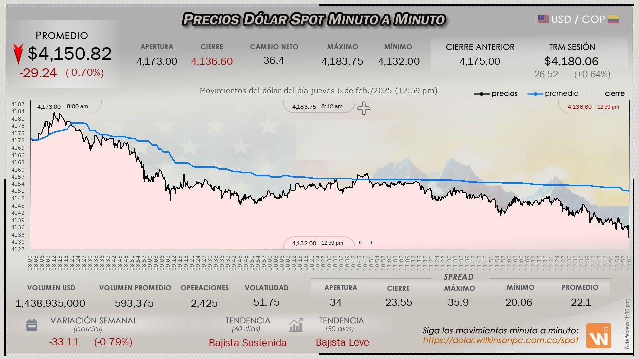 Resumen de las operaciones del mercado del dólar SPOT en Colombia correspondiente al jueves 6 de febrero de 2025.