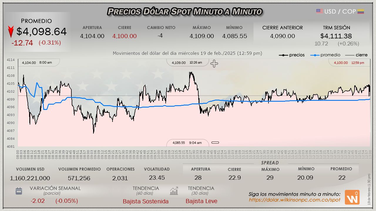 Resumen de las operaciones del mercado del dólar SPOT en Colombia correspondiente al miércoles 19 de febrero de 2025.