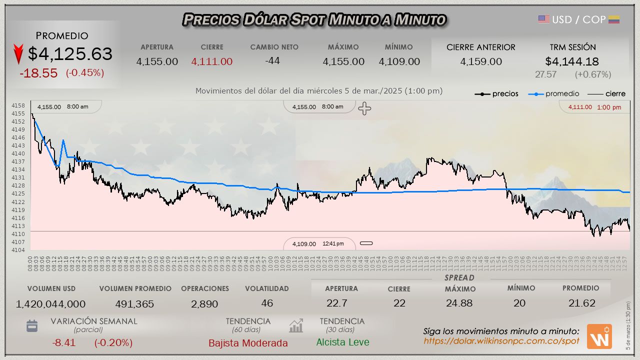 Resumen de las operaciones del mercado del dólar SPOT en Colombia correspondiente al miércoles 5 de marzo de 2025.