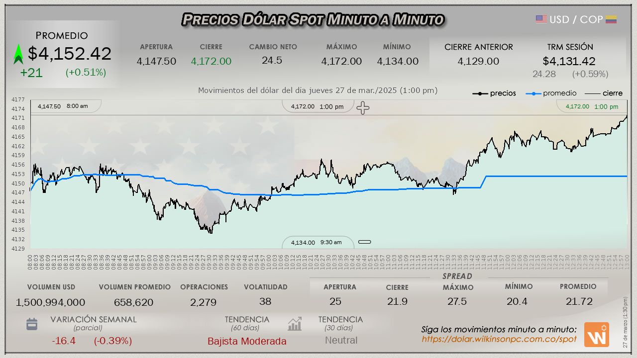 Resumen de las operaciones del mercado del dólar SPOT en Colombia correspondiente al jueves 27 de marzo de 2025.