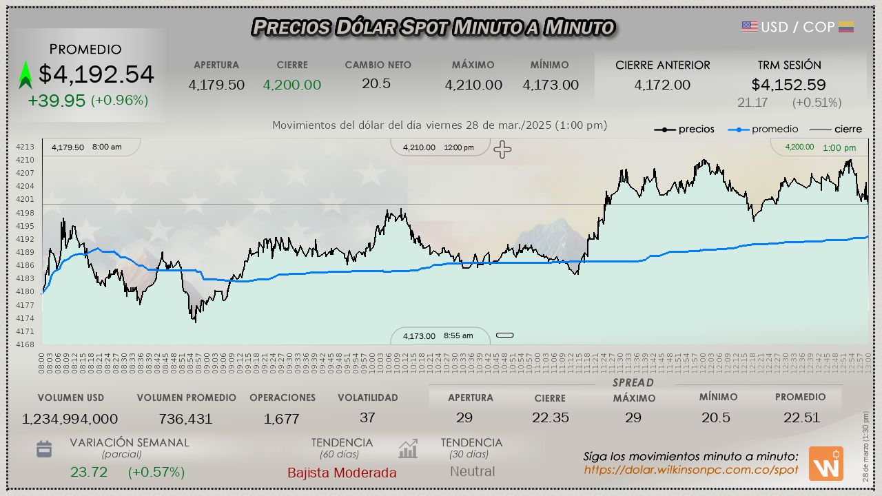 Resumen de las operaciones del mercado del dólar SPOT en Colombia correspondiente al viernes 28 de marzo de 2025.