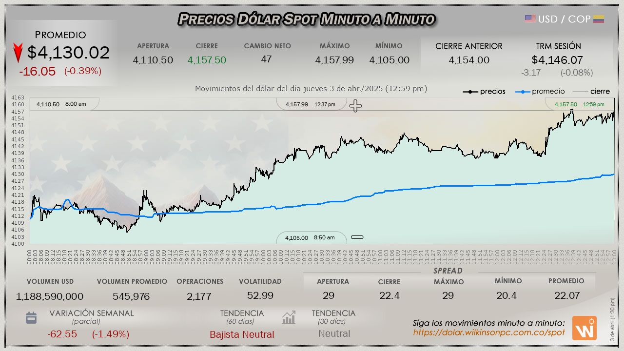 Resumen de las operaciones del mercado del dólar SPOT en Colombia correspondiente al jueves 3 de abril de 2025.