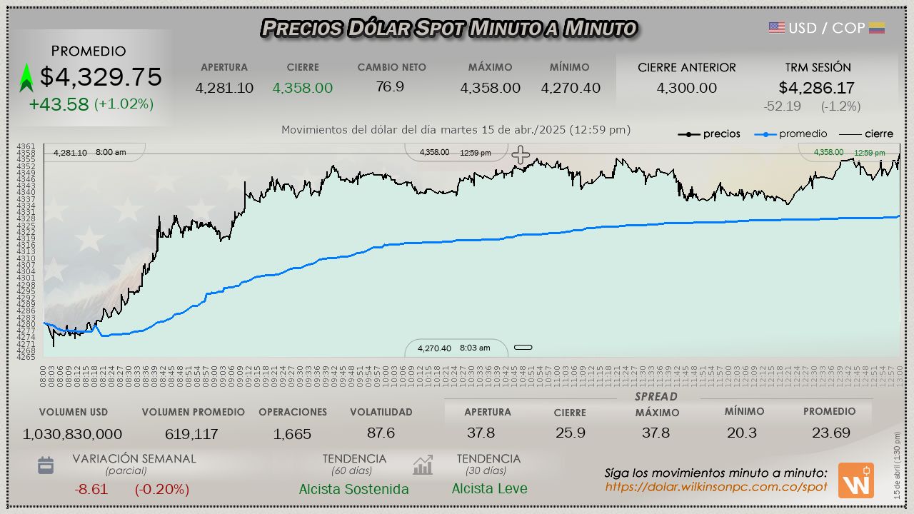 Resumen de las operaciones del mercado del dólar SPOT en Colombia correspondiente al martes 15 de abril de 2025.