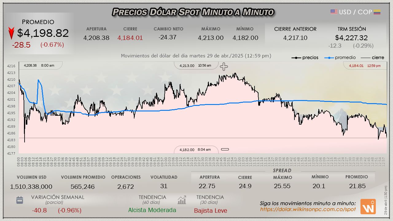 Resumen de las operaciones del mercado del dólar SPOT en Colombia correspondiente al martes 29 de abril de 2025.