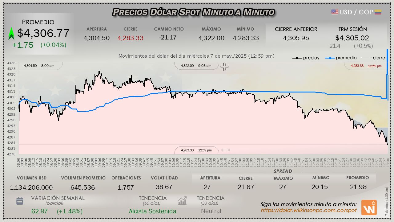 La sesión dió inicio con un precio de apertura de $4,304.50, marcaba así un descenso comparado con la TRM vigente de $4,305.02. Durante la jornada, el precio alcanzó un máximo de $4,322.00 pesos, y un mínimo de $4,283.33 pesos, generando una volatilidad intradía de $38.67 pesos. Al cierre de la jornada, se situó en $4,283.33, a la baja respecto a la apertura y por debajo de la TRM del día, aunque el promedio ponderado fue suficiente para marcar un alza de $1.75, terminó con un promedio de $4,306.77 pesos, un aumento del 0.04% respecto a la TRM. Este aumento fue el resultado de una recuperación de la tendencia inicial a la baja.