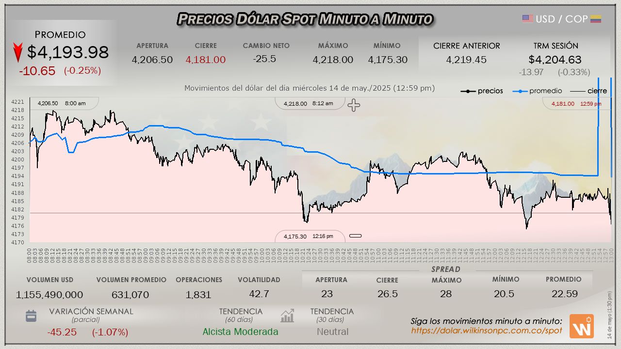 La jornada inició con un precio de apertura de $4,206.50, que superaba a la TRM vigente de $4,204.63. Durante la jornada, el precio alcanzó un máximo de $4,218.00 pesos, y un mínimo de $4,175.30 pesos, generando una volatilidad intradía de $42.70 pesos. Al cierre de la jornada, se situó en $4,181.00, a la baja respecto a la apertura y por debajo de la TRM del día, quedando con un promedio ponderado de $4,193.98, una pérdida de $-10.65 pesos, un -0.25% menos respecto a la TRM. Este descenso fue causado por una reversión de la tendencia observada al inicio de la sesión.
