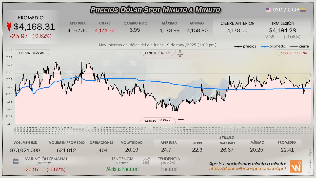 Resumen de las operaciones del mercado del dólar SPOT en Colombia correspondiente al lunes 19 de mayo de 2025.