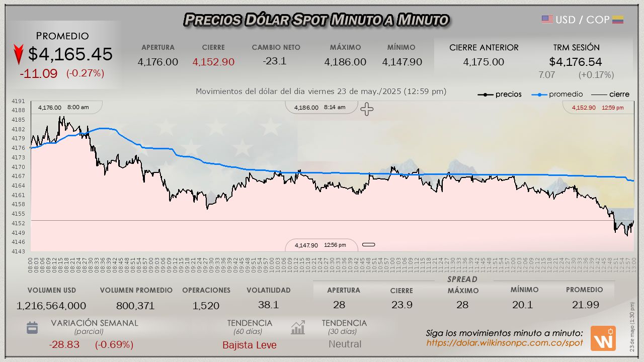 Resumen de las operaciones del mercado del dólar SPOT en Colombia correspondiente al viernes 23 de mayo de 2025.