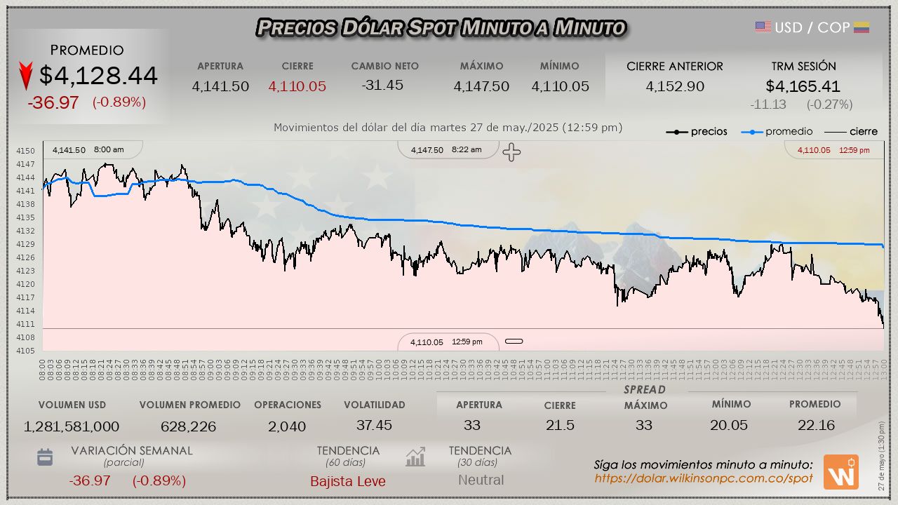 La sesión dió inicio con un precio de apertura de $4,141.50, marcaba así un descenso comparado con la TRM vigente de $4,165.41. Durante la jornada, el precio alcanzó un máximo de $4,147.50 pesos, y un mínimo de $4,110.05 pesos, generando una volatilidad intradía de $37.45 pesos. Al cierre de la jornada, se situó en $4,110.05, a la baja respecto a la apertura y por debajo de la TRM del día, quedando con un promedio ponderado de $4,128.44, una pérdida de $-36.97 pesos, un -0.89% menos respecto a la TRM.