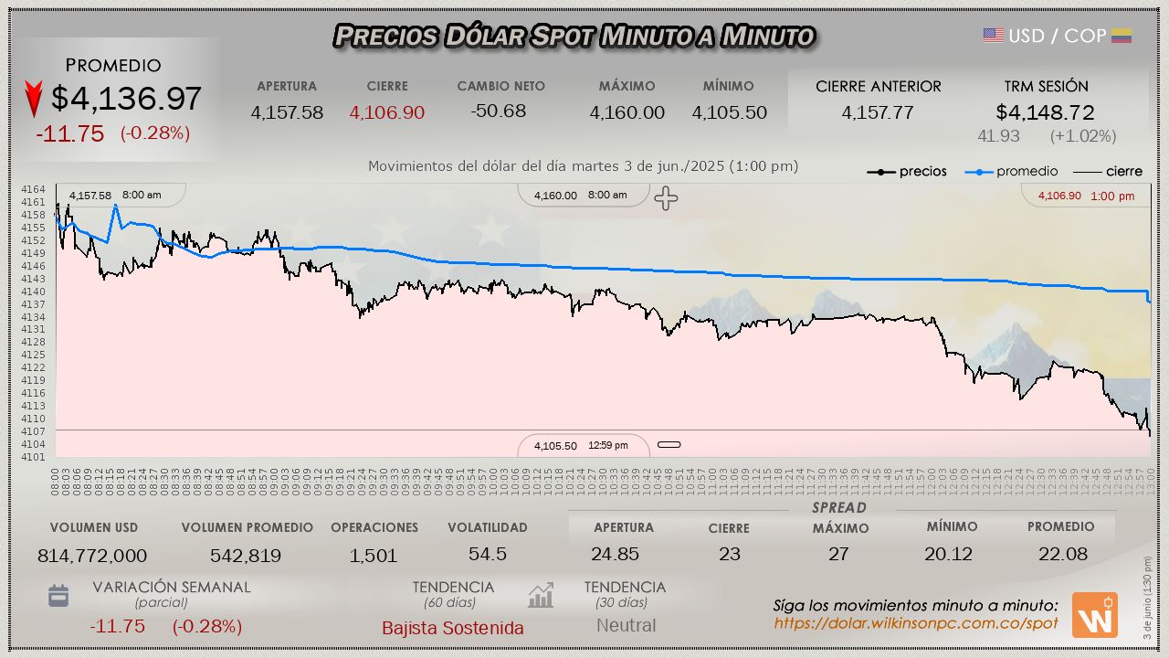 La jornada inició con un precio de apertura de $4,157.58, que superaba a la TRM vigente de $4,148.72. Durante la jornada, el precio alcanzó un máximo de $4,160.00 pesos, y un mínimo de $4,105.50 pesos, generando una volatilidad intradía de $54.50 pesos. Al cierre de la jornada, se situó en $4,106.90, a la baja respecto a la apertura y por debajo de la TRM del día, quedando con un promedio ponderado de $4,136.97, una pérdida de $-11.75 pesos, un -0.28% menos respecto a la TRM. Este descenso fue causado por una reversión de la tendencia observada al inicio de la sesión.