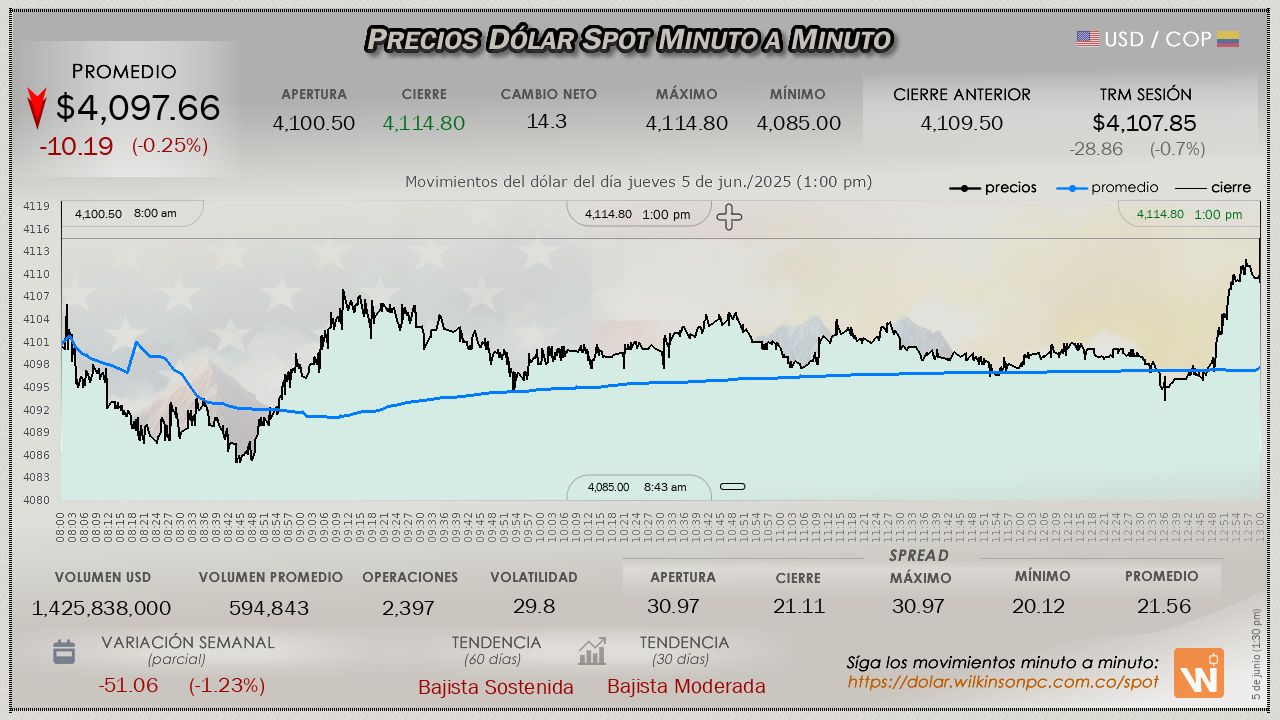 Resumen de las operaciones del mercado del dólar SPOT en Colombia correspondiente al jueves 5 de junio de 2025.