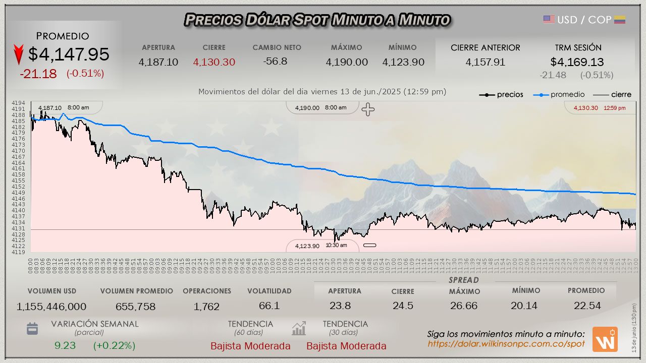La jornada inició con un precio de apertura de $4,187.10, que superaba a la TRM vigente de $4,169.13. Durante la jornada, el precio alcanzó un máximo de $4,190.00 pesos, y un mínimo de $4,123.90 pesos, generando una volatilidad intradía de $66.10 pesos. Al cierre de la jornada, se situó en $4,130.30, a la baja respecto a la apertura y por debajo de la TRM del día, quedando con un promedio ponderado de $4,147.95, una pérdida de $-21.18 pesos, un -0.51% menos respecto a la TRM. Este descenso fue causado por una reversión de la tendencia observada al inicio de la sesión.