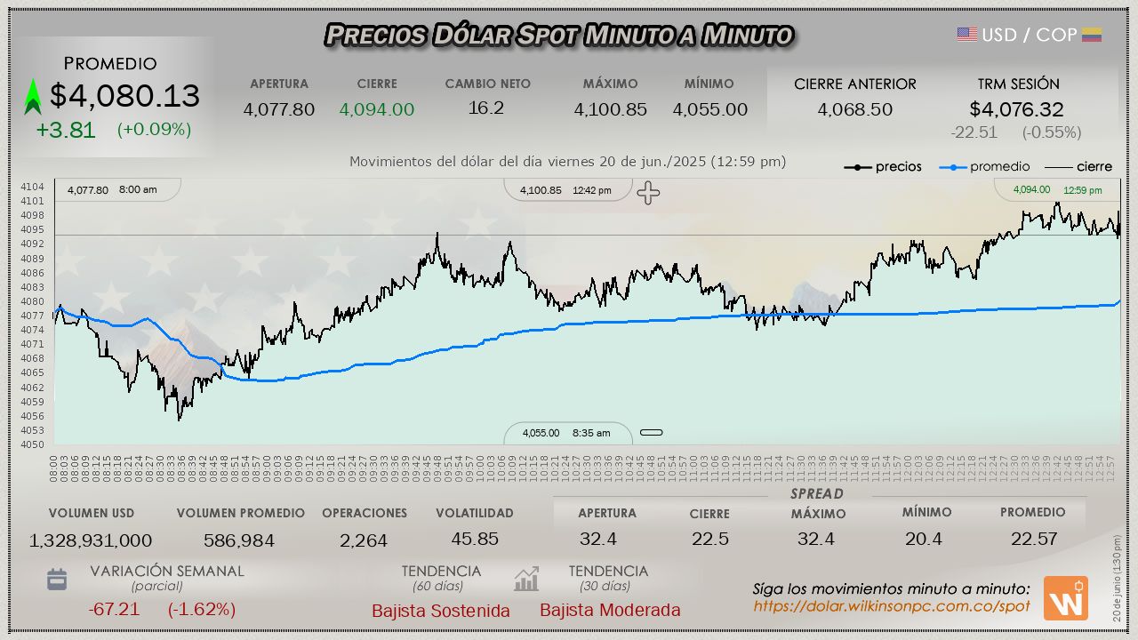 Resumen de las operaciones del mercado del dólar SPOT en Colombia correspondiente al viernes 20 de junio de 2025.