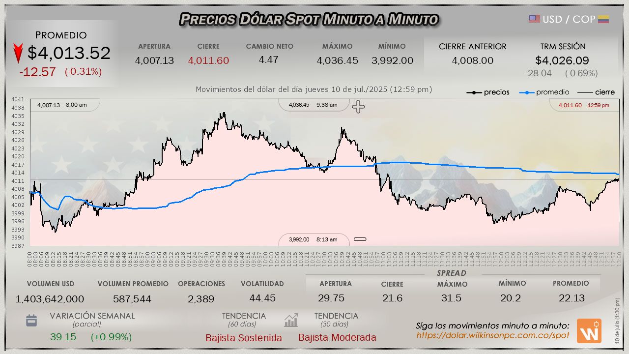 Resumen de las operaciones del mercado del dólar SPOT en Colombia correspondiente al jueves 10 de julio de 2025.