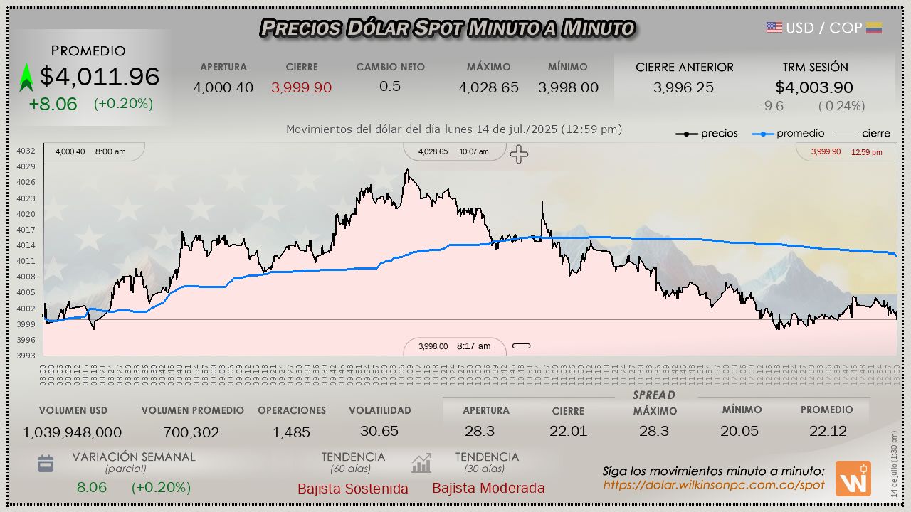 Resumen de las operaciones del mercado del dólar SPOT en Colombia correspondiente al lunes 14 de julio de 2025.