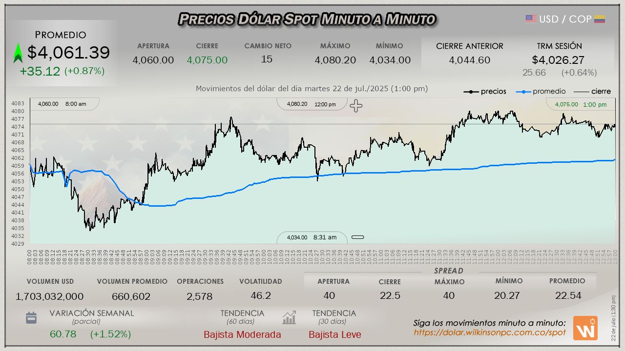 Resumen de las operaciones del mercado del dólar SPOT en Colombia correspondiente al martes 22 de julio de 2025.