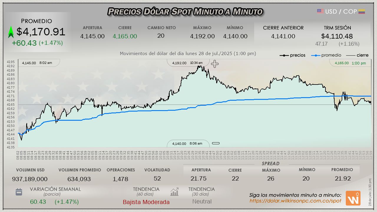 Resumen de las operaciones del mercado del dólar SPOT en Colombia correspondiente al lunes 28 de julio de 2025.