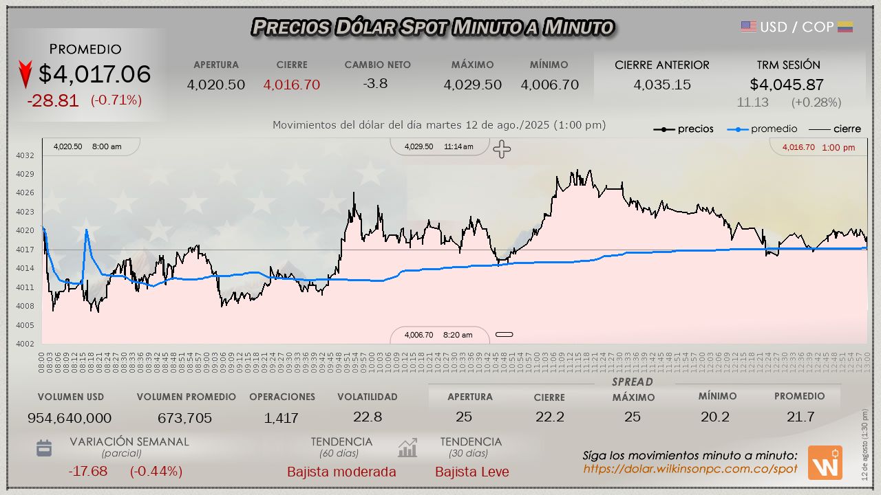 Resumen de las operaciones del mercado del dólar SPOT en Colombia correspondiente al martes 12 de agosto de 2025.