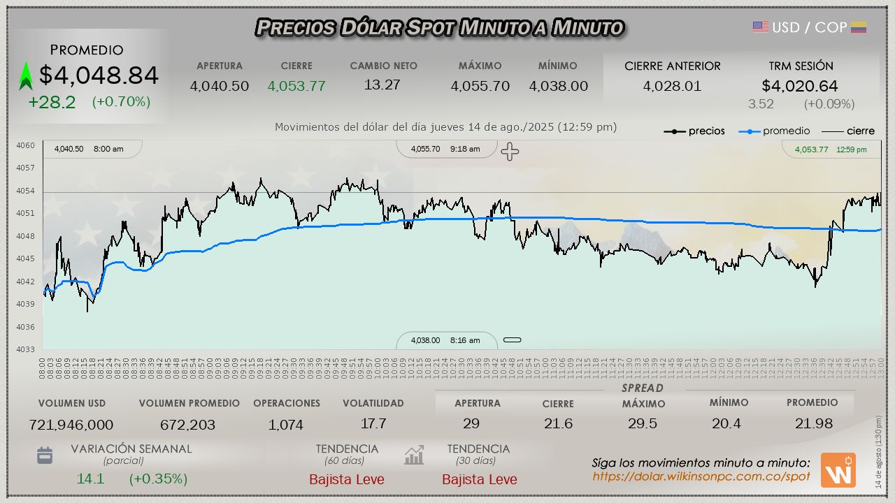 Resumen de las operaciones del mercado del dólar SPOT en Colombia correspondiente al jueves 14 de agosto de 2025.
