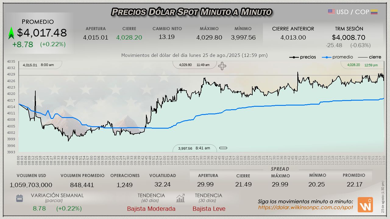 Resumen de las operaciones del mercado del dólar SPOT en Colombia correspondiente al lunes 25 de agosto de 2025.