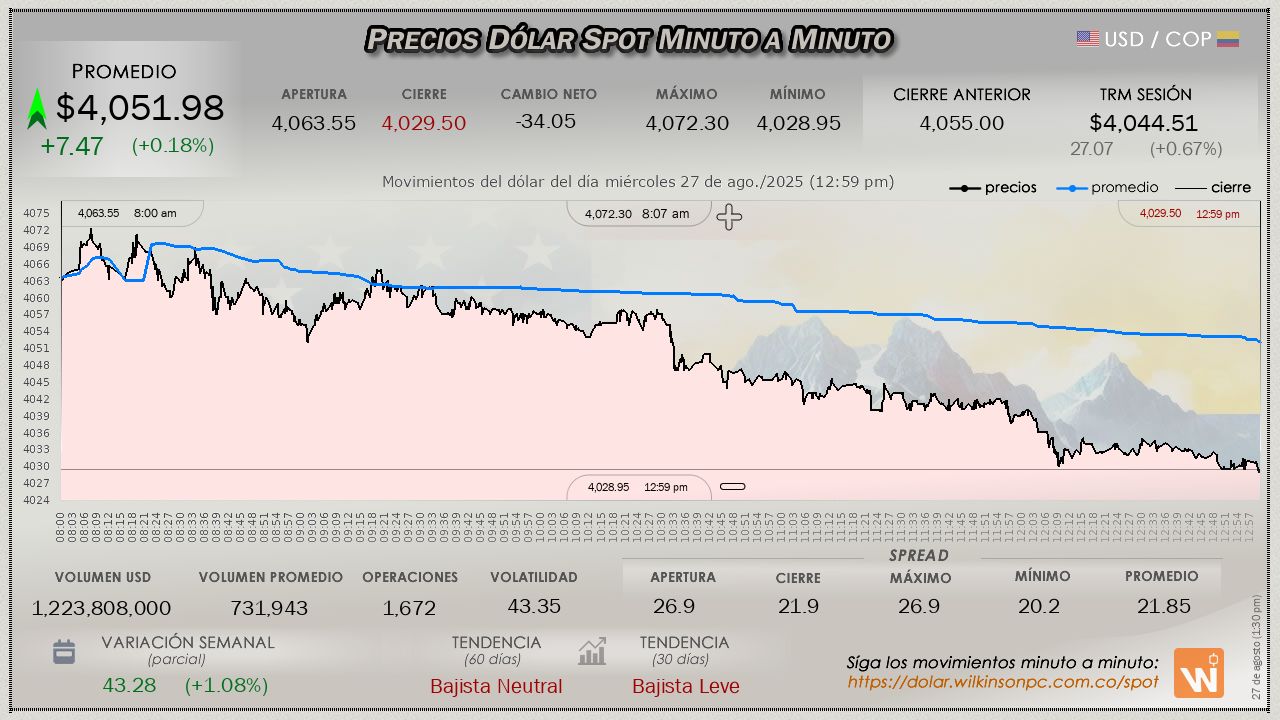 Resumen de las operaciones del mercado del dólar SPOT en Colombia correspondiente al miércoles 27 de agosto de 2025.