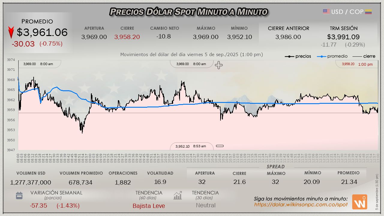 La sesión dió inicio con un precio de apertura de $3,969.00, marcaba así un descenso comparado con la TRM vigente de $3,991.09. Durante la jornada, el precio alcanzó un máximo de $3,969.00 pesos, y un mínimo de $3,952.10 pesos, generando una volatilidad intradía de $16.90 pesos. Al cierre de la jornada, se situó en $3,958.20, a la baja respecto a la apertura y por debajo de la TRM del día, quedando con un promedio ponderado de $3,961.06, una pérdida de $-30.03 pesos, un -0.75% menos respecto a la TRM.