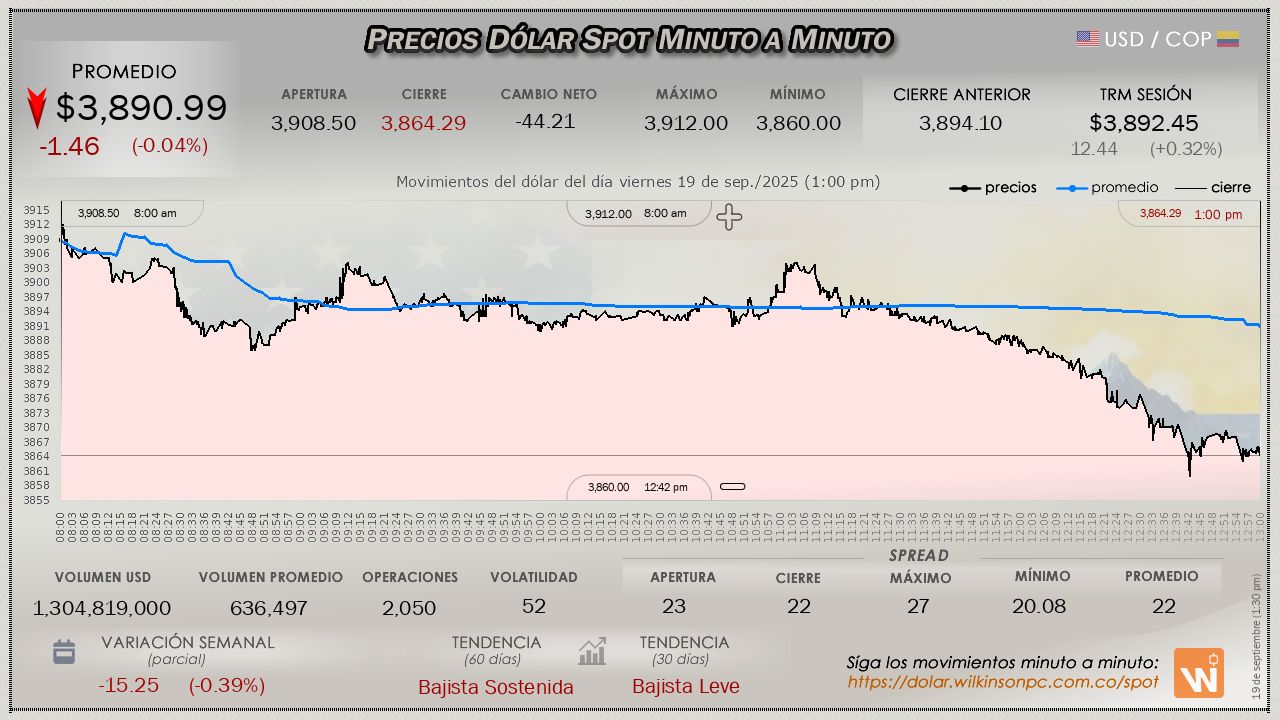 La jornada inició con un precio de apertura de $3,908.50, que superaba a la TRM vigente de $3,892.45. Durante la jornada, el precio alcanzó un máximo de $3,912.00 pesos, y un mínimo de $3,860.00 pesos, generando una volatilidad intradía de $52.00 pesos. Al cierre de la jornada, se situó en $3,864.29, a la baja respecto a la apertura y por debajo de la TRM del día, quedando con un promedio ponderado de $3,890.99, una pérdida de $-1.46 pesos, un -0.04% menos respecto a la TRM. Este descenso fue causado por una reversión de la tendencia observada al inicio de la sesión.