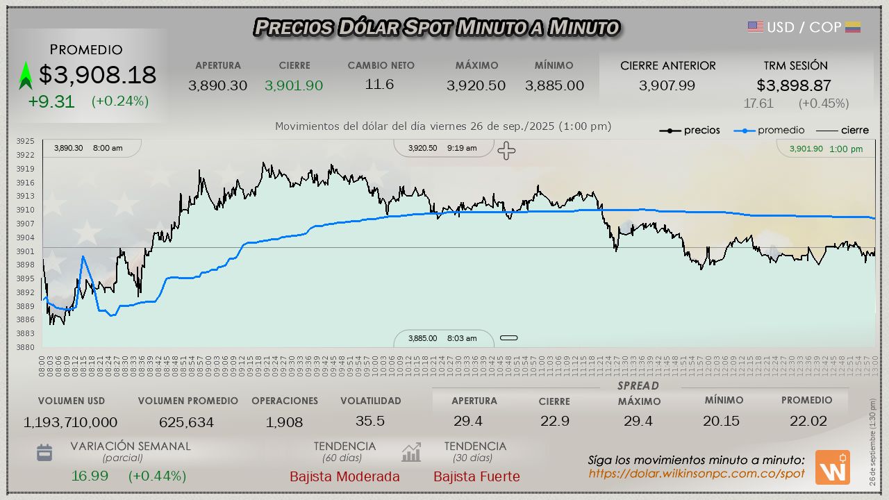 La sesión dió inicio con un precio de apertura de $3,890.30, marcaba así un descenso comparado con la TRM vigente de $3,898.87. Durante la jornada, el precio alcanzó un máximo de $3,920.50 pesos, y un mínimo de $3,885.00 pesos, generando una volatilidad intradía de $35.50 pesos. Al final de la sesión, el precio cerró al alza respecto a la apertura a un precio de $3,901.90 y por encima de la TRM fijada para el día, al igual que el promedio ponderado con un valor de $3,908.18, una diferencia de $9.31 pesos, un aumento del 0.24% respecto a la TRM. Este aumento fue el resultado de una recuperación de la tendencia inicial a la baja.