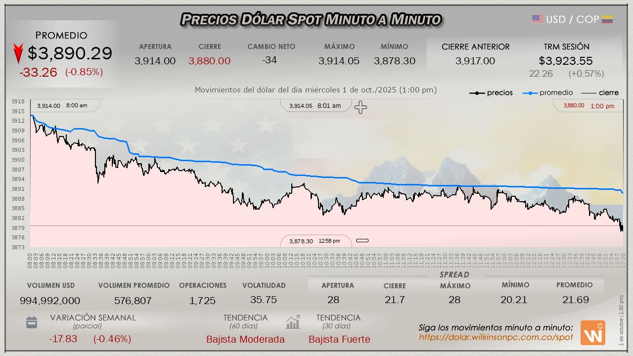 Resumen de las operaciones del mercado del dólar SPOT en Colombia correspondiente al miércoles 1 de octubre de 2025.