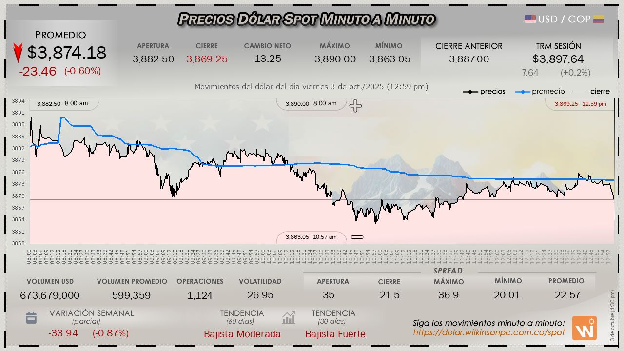 Resumen de las operaciones del mercado del dólar SPOT en Colombia correspondiente al viernes 3 de octubre de 2025.