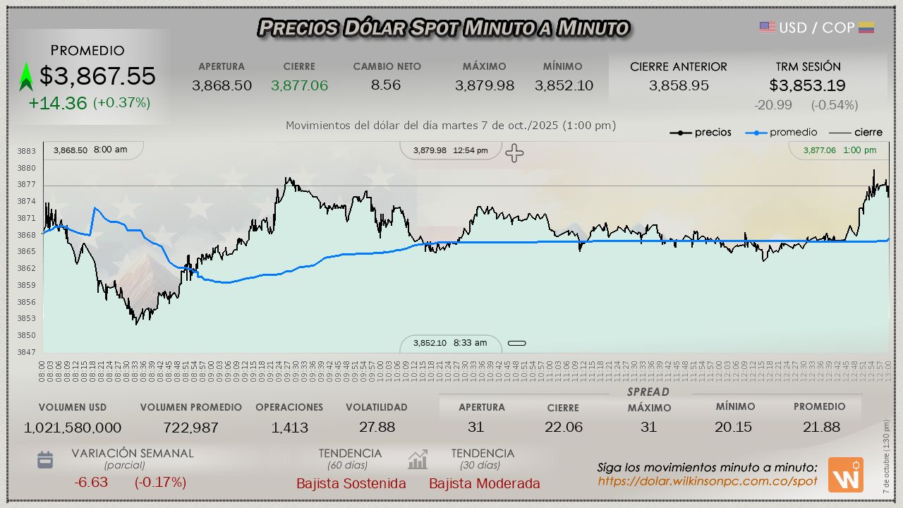 La jornada inició con un precio de apertura de $3,868.50, que superaba a la TRM vigente de $3,853.19. Durante la jornada, el precio alcanzó un máximo de $3,879.98 pesos, y un mínimo de $3,852.10 pesos, generando una volatilidad intradía de $27.88 pesos. Al final de la sesión, el precio cerró al alza respecto a la apertura a un precio de $3,877.06 y por encima de la TRM fijada para el día, al igual que el promedio ponderado con un valor de $3,867.55, una diferencia de $14.36 pesos, un aumento del 0.37% respecto a la TRM.
