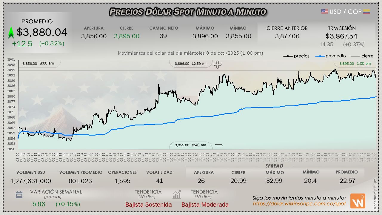 Resumen de las operaciones del mercado del dólar SPOT en Colombia correspondiente al miércoles 8 de octubre de 2025.