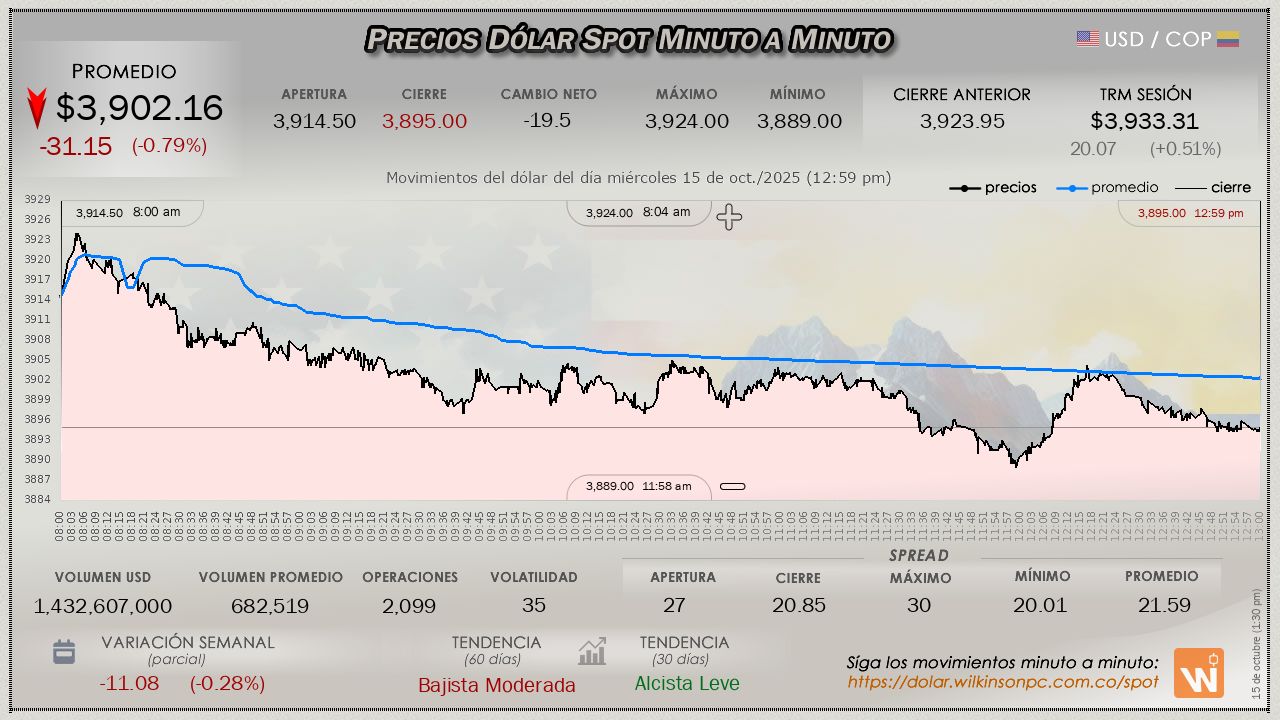 Resumen de las operaciones del mercado del dólar SPOT en Colombia correspondiente al miércoles 15 de octubre de 2025.