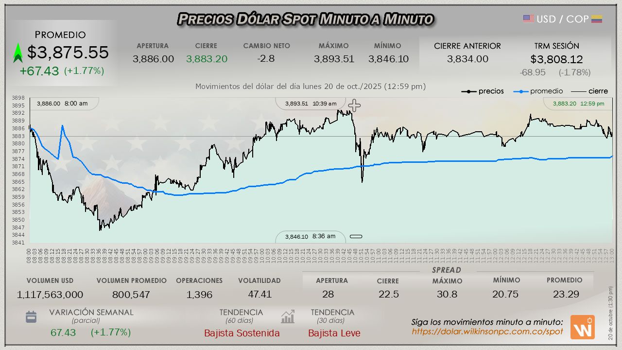 Resumen de las operaciones del mercado del dólar SPOT en Colombia correspondiente al lunes 20 de octubre de 2025.