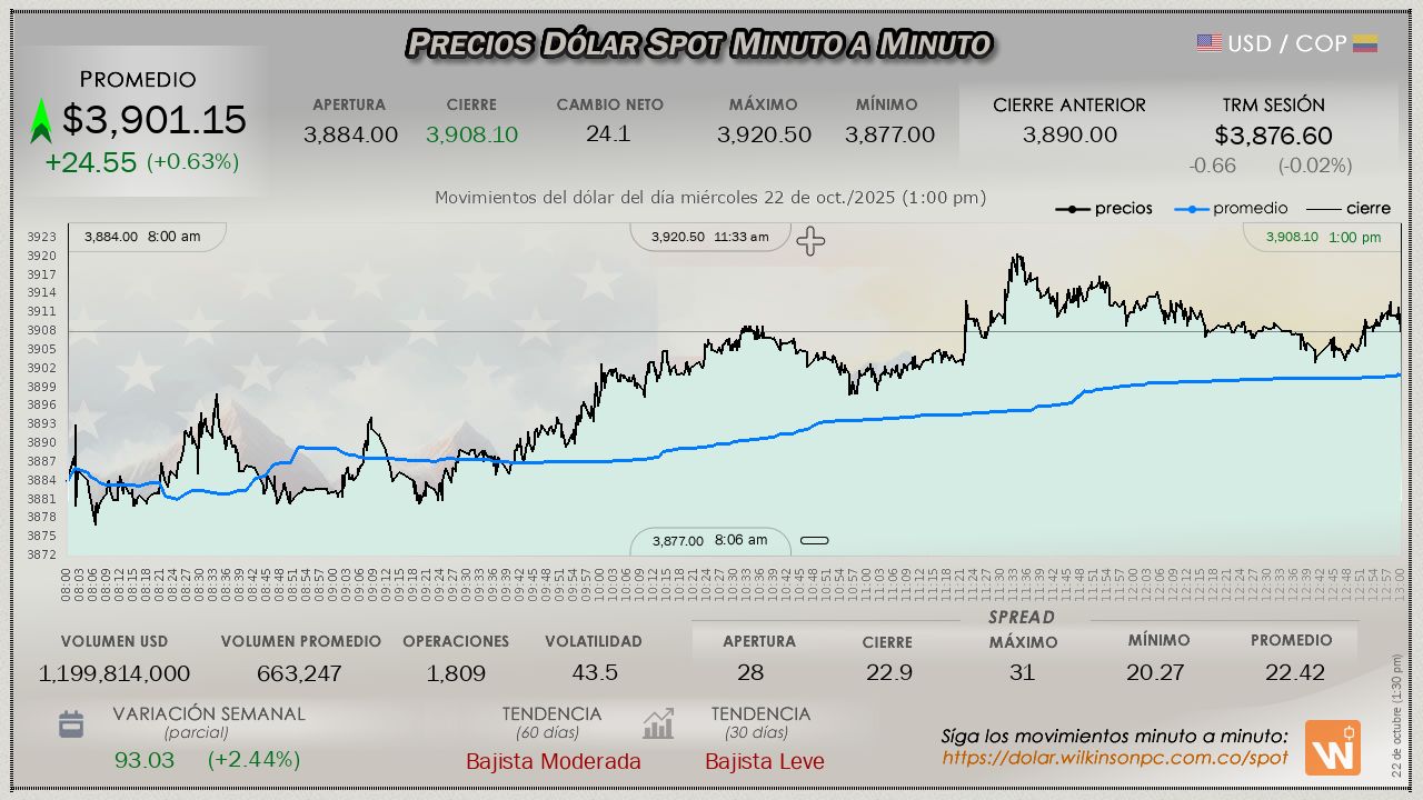 Resumen de las operaciones del mercado del dólar SPOT en Colombia correspondiente al miércoles 22 de octubre de 2025.