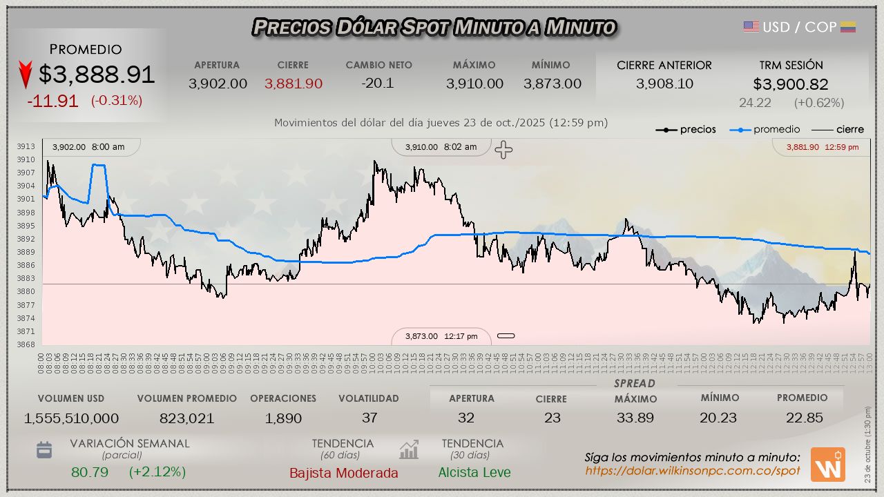 Resumen de las operaciones del mercado del dólar SPOT en Colombia correspondiente al jueves 23 de octubre de 2025.