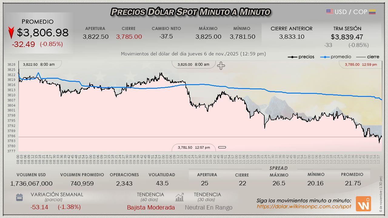 La sesión dió inicio con un precio de apertura de $3,822.50, marcaba así un descenso comparado con la TRM vigente de $3,839.47. Durante la jornada, el precio alcanzó un máximo de $3,825.00 pesos, y un mínimo de $3,781.50 pesos, generando una volatilidad intradía de $43.50 pesos. Al cierre de la jornada, se situó en $3,785.00, a la baja respecto a la apertura y por debajo de la TRM del día, quedando con un promedio ponderado de $3,806.98, una pérdida de $-32.49 pesos, un -0.85% menos respecto a la TRM.