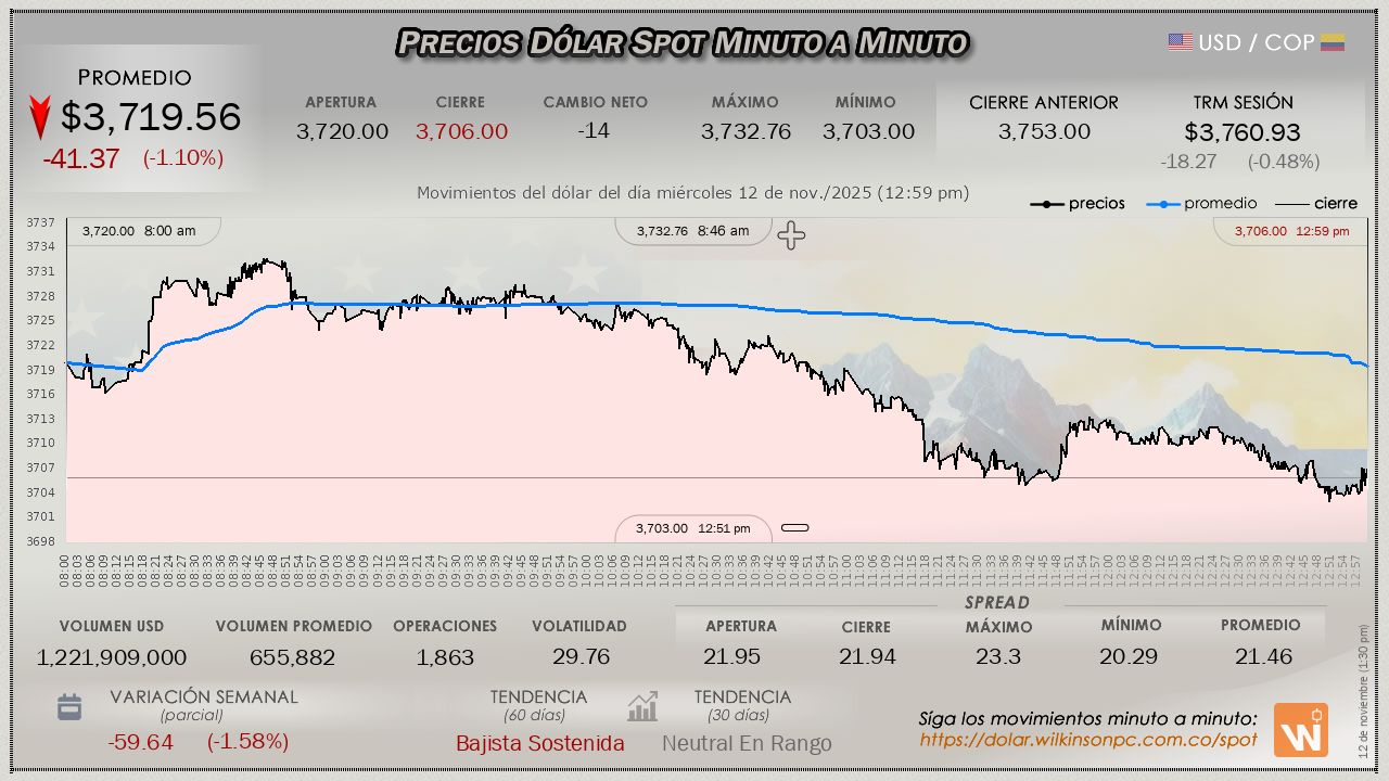Resumen de las operaciones del mercado del dólar SPOT en Colombia correspondiente al miércoles 12 de noviembre de 2025.