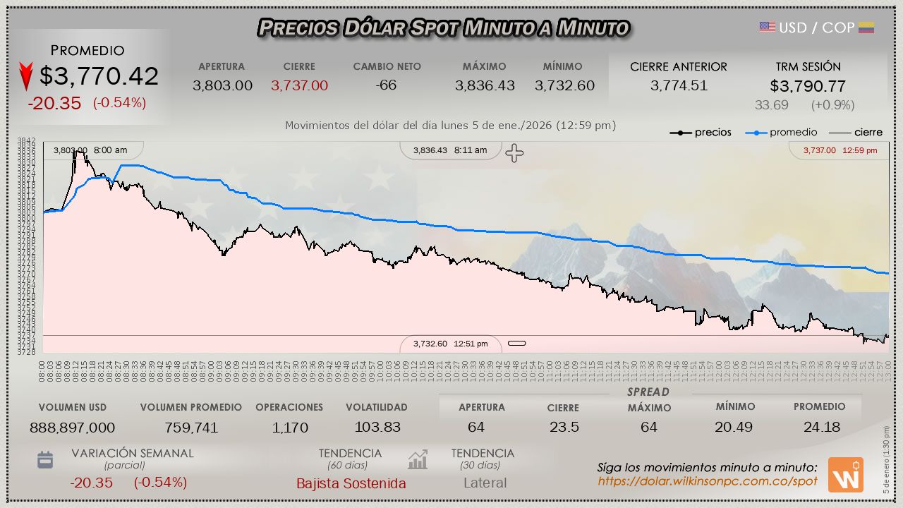 La jornada inició con un precio de apertura de $3,803.00, que superaba a la TRM vigente de $3,790.77. Durante la jornada, el precio alcanzó un máximo de $3,836.43 pesos, y un mínimo de $3,732.60 pesos, generando una volatilidad intradía de $103.83 pesos. Al cierre de la jornada, se situó en $3,737.00, a la baja respecto a la apertura y por debajo de la TRM del día, quedando con un promedio ponderado de $3,770.42, una pérdida de $-20.35 pesos, un -0.54% menos respecto a la TRM. Este descenso fue causado por una reversión de la tendencia observada al inicio de la sesión.