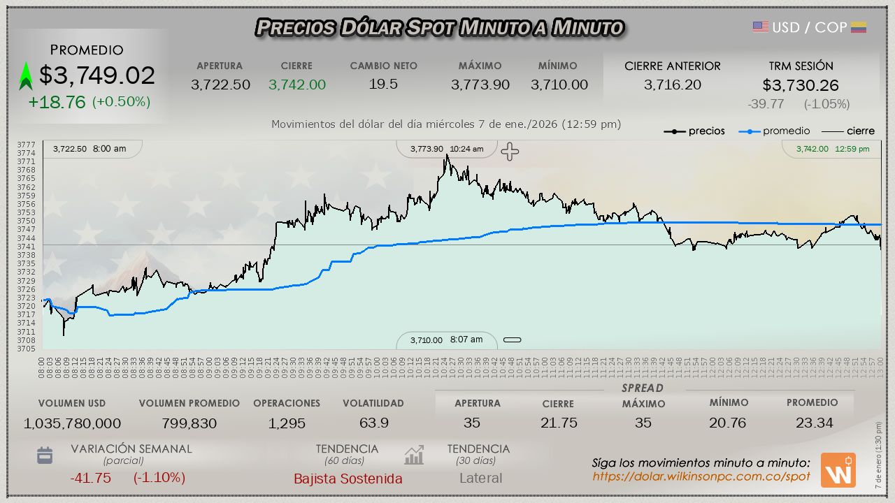 Resumen de las operaciones del mercado del dólar SPOT en Colombia correspondiente al miércoles 7 de enero de 2026.